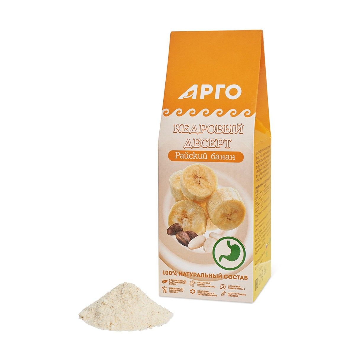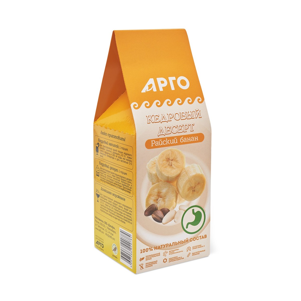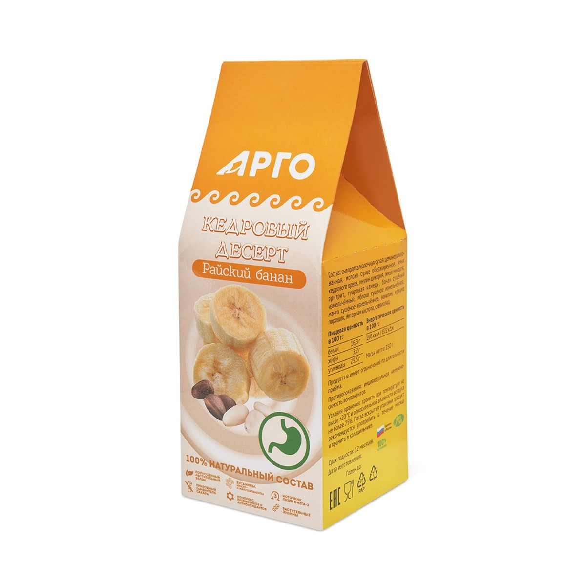 - Поддерживает здоровое состояние и защищает желудочно-кишечный тракт за счёт полиненасыщенных жирных кислот миндаля и кедрового ореха, противовоспалительных и антиоксидантных веществ куркумы, комплекса пищевых волокон и компонентов банана, яблока и манго.
