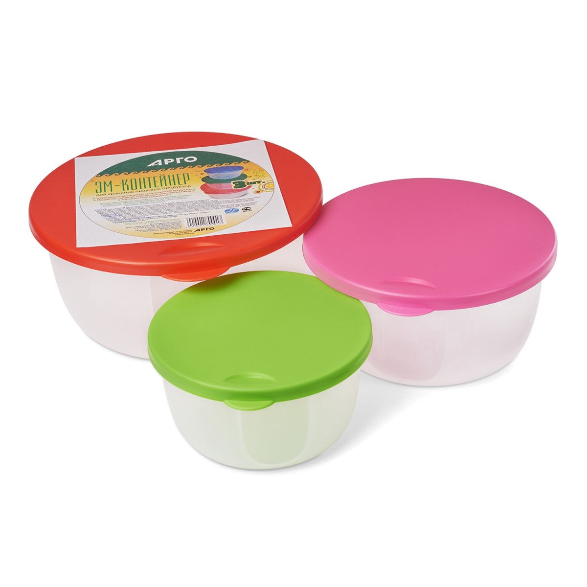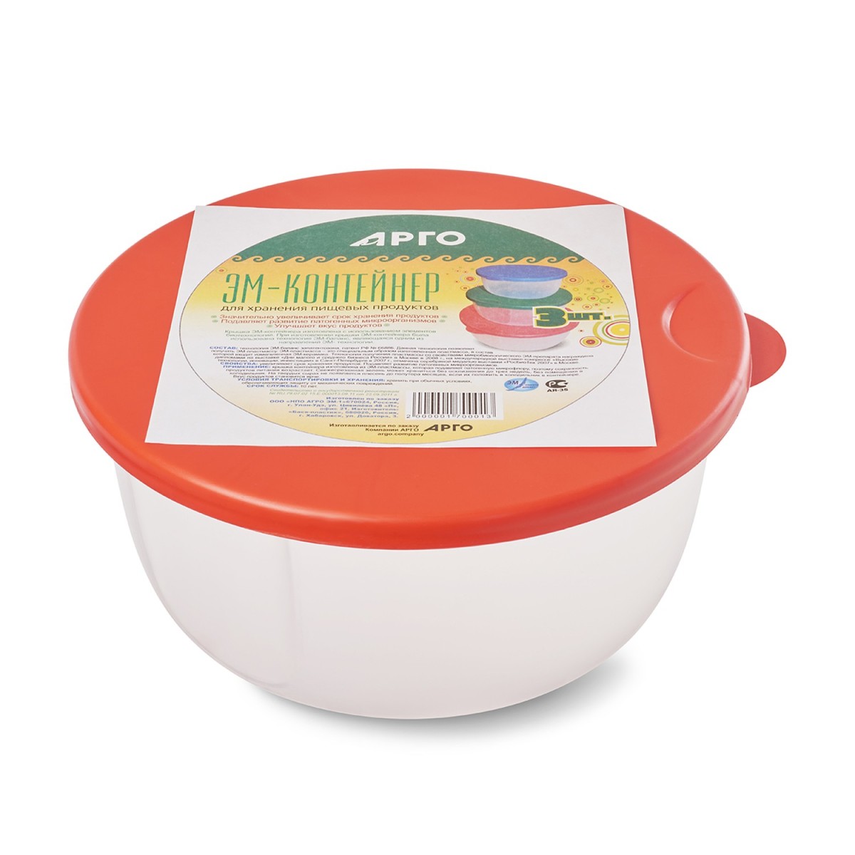 В наборе три ЭМ-контейнера из ЭМ-пластмассы емкостью 2,0 л, 1,2 л, 0,7 л.