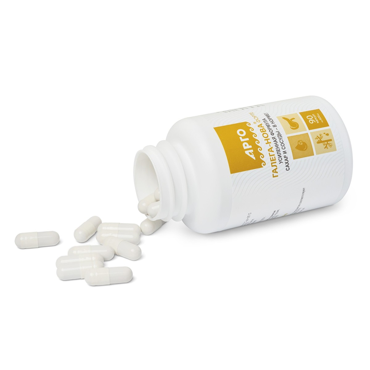 БАД Галега-Нова-форте обладает комплексным воздействием на состояние сосудистой системы, снижает уровень глюкозы и холестерина в крови, обладает антиатеросклеротическим, сосудоукрепляющим эффектами, нормализует водно-солевой, углеводный, жировой обмены, что позволяет применять его в комплексной терапии сахарного диабета и его осложнений. Комплекс экстрактов корня лопуха, плодов шиповника, моркови также обеспечивает гранулам противовоспалительное, жаропонижающее, слабительное, мочегонное действиe.