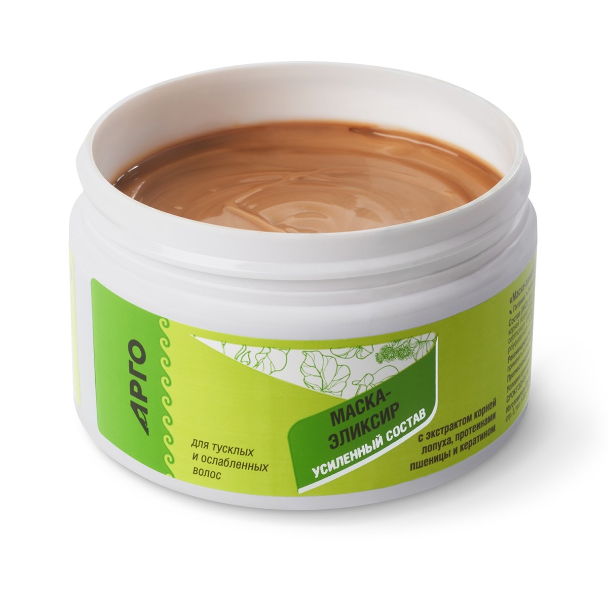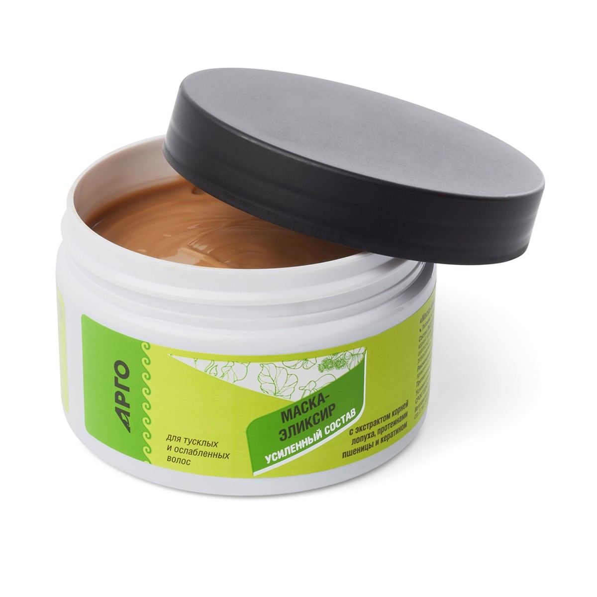 Ключевыми компонентами маски для волос от Арго являются экстракт корней лопуха большого, масло ши, гидролизованные протеины пшеницы, гидролизованный кератин, аллантоин, витамины Е.